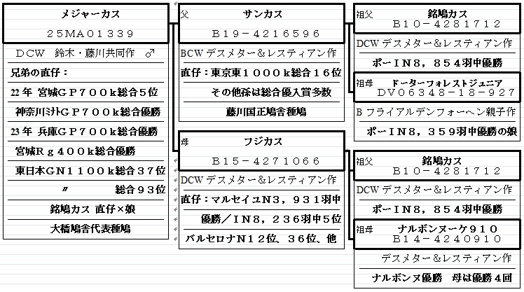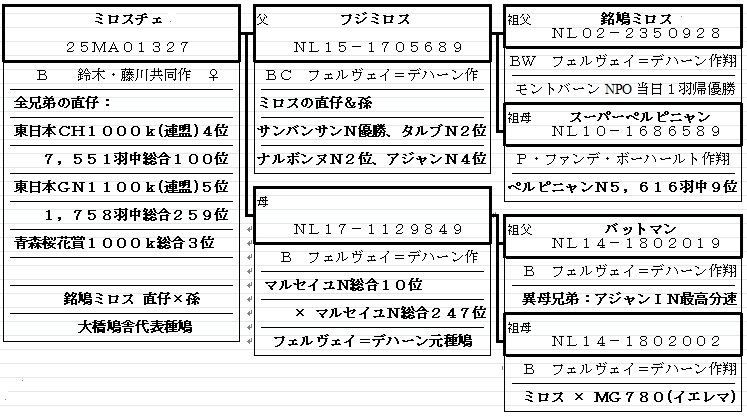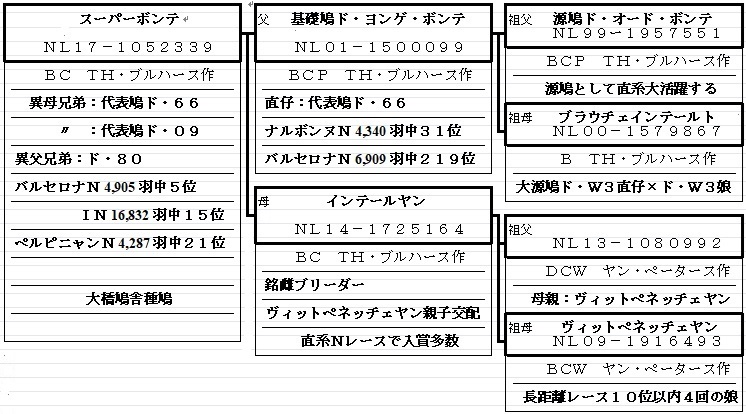 グランド&グランプリを帰すに当たって長距離で実績のある血統を織り込んでいく事が近道と考えて導入しました。 ヨーロッパの長距離で活躍している”ヨースト”で有名なデスメター&レスティアーン鳩舎の鳩に興味を持ち、その中でも”カス:ポーIN8,854羽中優勝”のラインが気になっていました。 30年以上前からお付き合いしているキッドで有名な鈴木信義鳩舎に良く飛んでいるカスのラインが居たので”メジャーカス”(カス直仔×娘)を導入しました。 メジャーカスに合うと判断してレース鳩誌の9月号の広告に出ていたフェルヴェイ・デハーンの”ミロス”近親の”ミロスチェ”(ミロス直仔×孫)を鈴木信義鳩舎から導入しました。 ミロスラインはフェルヴェイ・デハーン鳩舎ではありませんが、22年のバルセロナINで総合優勝していてデハーン鳩舎も同年のバルセロナIN総合36位、44位、46位と50位以内に3羽入賞しています。 ”スーパーボンテ”はテオ&ベルナール・ブルハース作で、異母兄弟にはド・80:バルセロナN4,905羽中5位/IN16,832羽中15位が居て、父親は源鳩ド・オードボンテの直仔で現在基礎鳩の1羽のド・ヨングボンテです。 ”ブルハースレディ”もテオ&ベルナール・ブルハース作の鳩で全兄弟がアジャンN955k6,019羽中36位、ベルジェラックN908k10,283羽中68位に入賞しています。 *テオ&ベルナール・ブルハース鳩舎は、大昔になりますが名古屋の増田鳩舎が輸入した”ハーキュリー”を作翔した鳩舎でオールドデルバール&スケルケンスを基礎として現在も活躍してします。 |