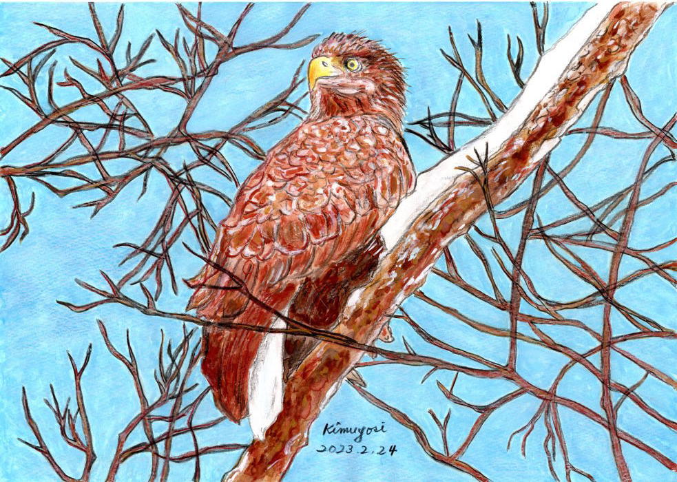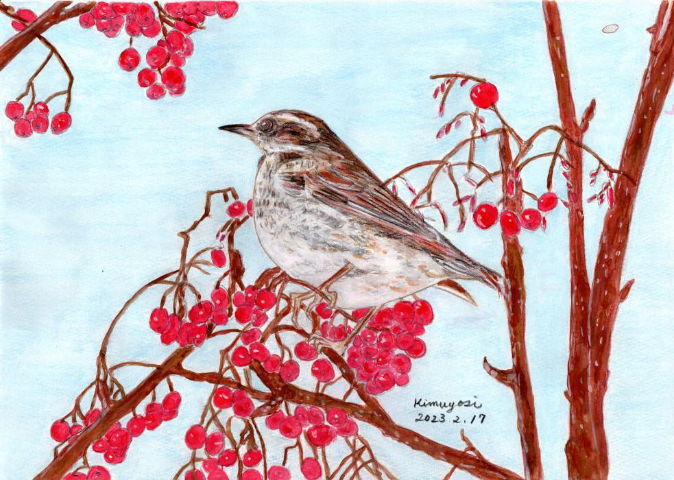 ナナカマドの実を啄むツグミ(2023,2,17)
