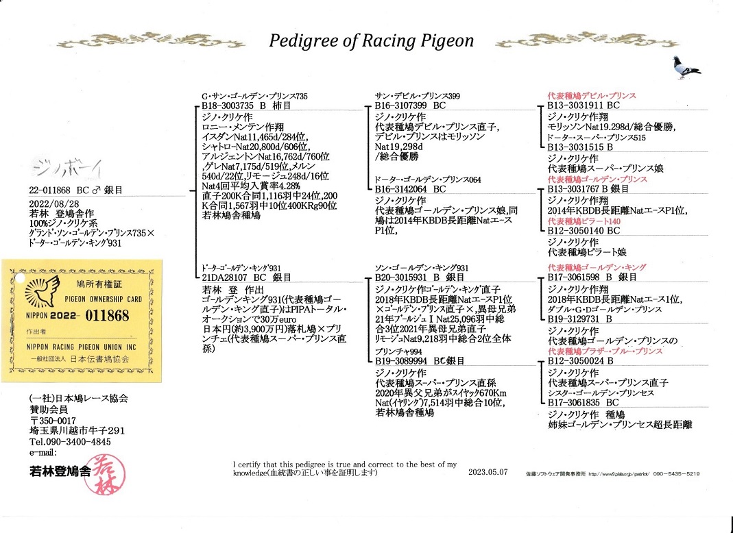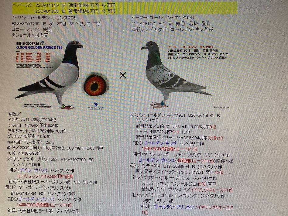 浅手の銀目の鳩で全兄弟が分譲されていた広告です! ↑↑↑↑クリック↑↑↑↑↑ ![]() "ジノボーイ" N22−011868 BC ♂ 若林 登作 100%ジノ・クリケ系 父)G・S・ゴールデンプリンス735 B18−3003735 B ジノ・クリケ作/ロニー・メンテン使翔 イスダンN11,465羽中284位、シャトローN20,800羽中606位 アルジャントンN16,762羽中760位、ゲレN7,175羽中519位 祖父)サンデビルプリンス399 B16−3107399 ジノ・クリケ作 デビルプリンス(モリッソン19,298羽中優勝)直仔 祖母)D・ゴールデンプリンス64 B16−3142064 ジノ・クリケ作 ゴールデンプリンス(KBDB長距離NエースP1位)娘 母)D・ゴールデンキング931 21DA28107 BC 若林 登作 100%ジノ・クリケ系 代表鳩ゴールデンキング孫 祖父)B20−3015931 B ジノ・クリケ作 ゴールデンキング(KBDB長距離NエースP1位)直仔 祖母)プリンチャ994 B19−3089994 BC ジノ・クリケ作 スーパープリンス(ブールジュN総合5位)孫 ![]() ↑↑↑↑↑ クリックで大きくなります |